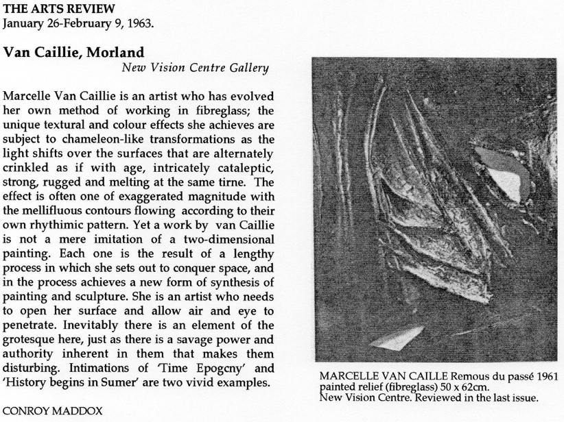 Marcelle van Caillie, or the first woman in the moon-thus spake the all-knowing critics. But is it really fair to reduce her convulsive configurations to some sort of viewer’s digest of lunar landscapes? Would it not be more rewarding to go straight to her work avoiding this detour to Cape Kennedy? But such endeavour to explore the works on their own terms must not be limited to a flat inventory of artists‘ materials. Van Caillie’s restless reliefs are not the end of our journey, they are the beginning – launching pads necessary for the mind’s flight. And this flight is valid only when it soars high above them. What we care for are not glass fibres, but human vibrations.